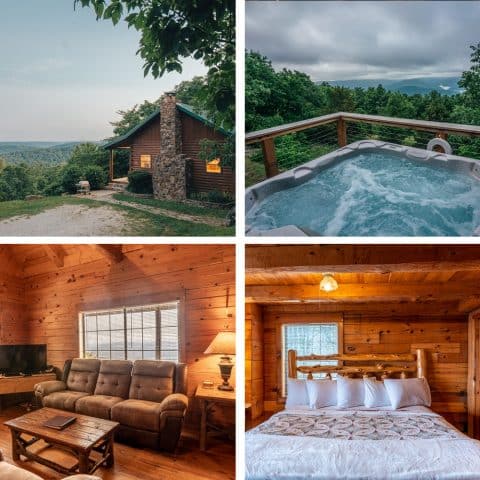 With its starry, starry nights or lofty morning views of mist-shrouded Ponca below, the Arkansas Cabin is a luxury cabin rental that’s hard to beat any time of day! Gaze up at the stars from your hot tub, then retreat indoors to the soft glow and warmth of your nativestone fireplace. During the day, rock in the porch swing with a good book or nap in your fluffy king-size bed. Whether you’re looking for a romantic getaway or a retreat for four (dbl occ), the Arkansas Cabin delivers on quality furnishings, spacious accommodations and amenities!