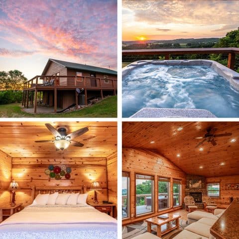 If you love sunsets, this is your cabin! Mountain Sunset is a 4-person cabin loaded with perks, including private bedrooms, two shower baths, a spacious and fully furnished kitchen, a large living/dining area featuring a beautiful fireplace, and a wonderful outdoor hot tub deck with a marvelous view. If you’re looking for a “home-away-from-home” in Buffalo River country, this cabin is it!