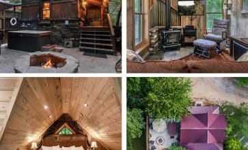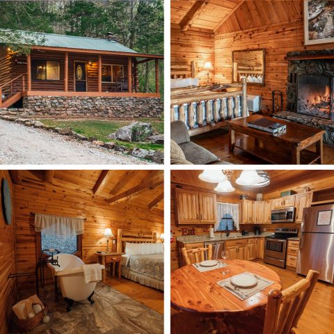 The Valley Secret Cabin offers couples a private, tucked-away location, as well as romantic amenities such as a beautiful bedside soaking tub for two, native-stone fireplace and king-size bed. See below for a complete list of this romantic cabin’s amenities!